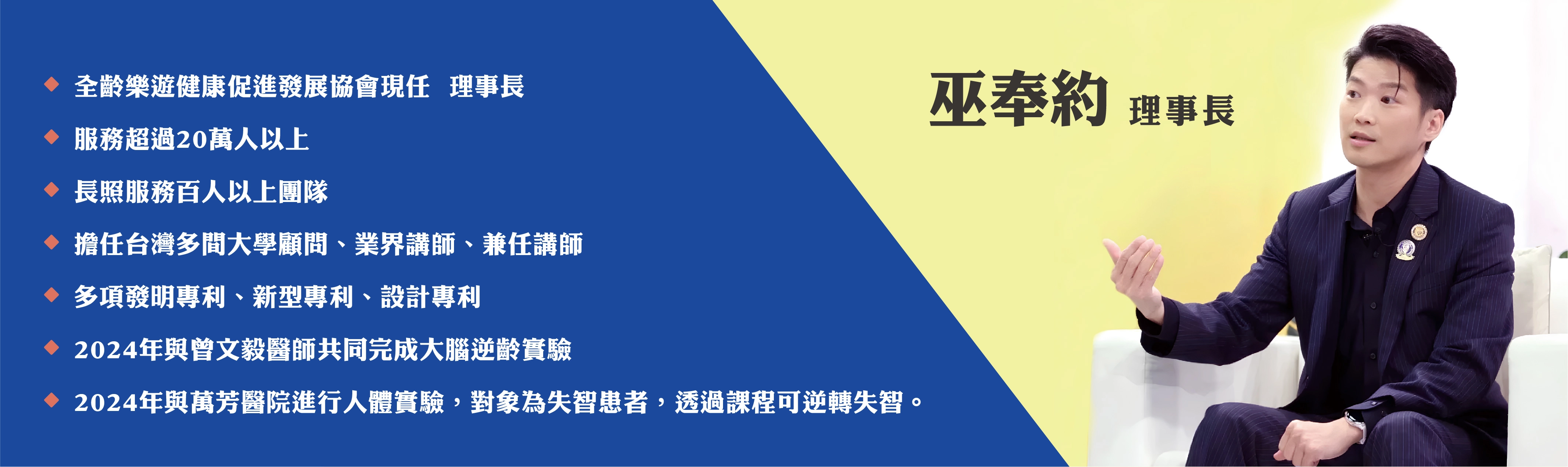 巫奉約,認知健康促進及功能型桌遊設計專家,因自身年輕時遭遇嚴重車禍導致短暫性失智,深刻體悟到認知健康的重要性。回台後投入長者健康照護產業十餘年,研發超過60款適合各年齡層的功能型桌遊,致力於失智症預防與認知能力提升。與萬芳醫院、新光銀行、台安醫院等單位合作,推廣以科學實證為基礎的認知增能計畫,成功協助許多長輩延緩失智症狀,改善生活品質,並積極推廣腦健康教育,提升社會對失智症的認識與重視。